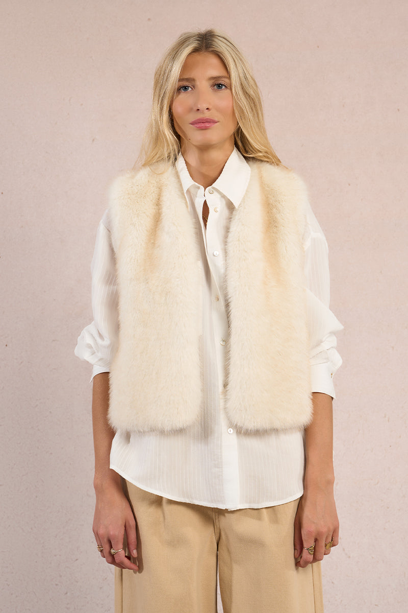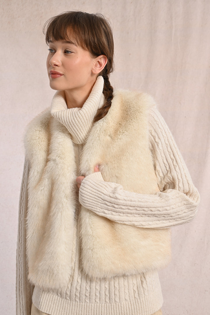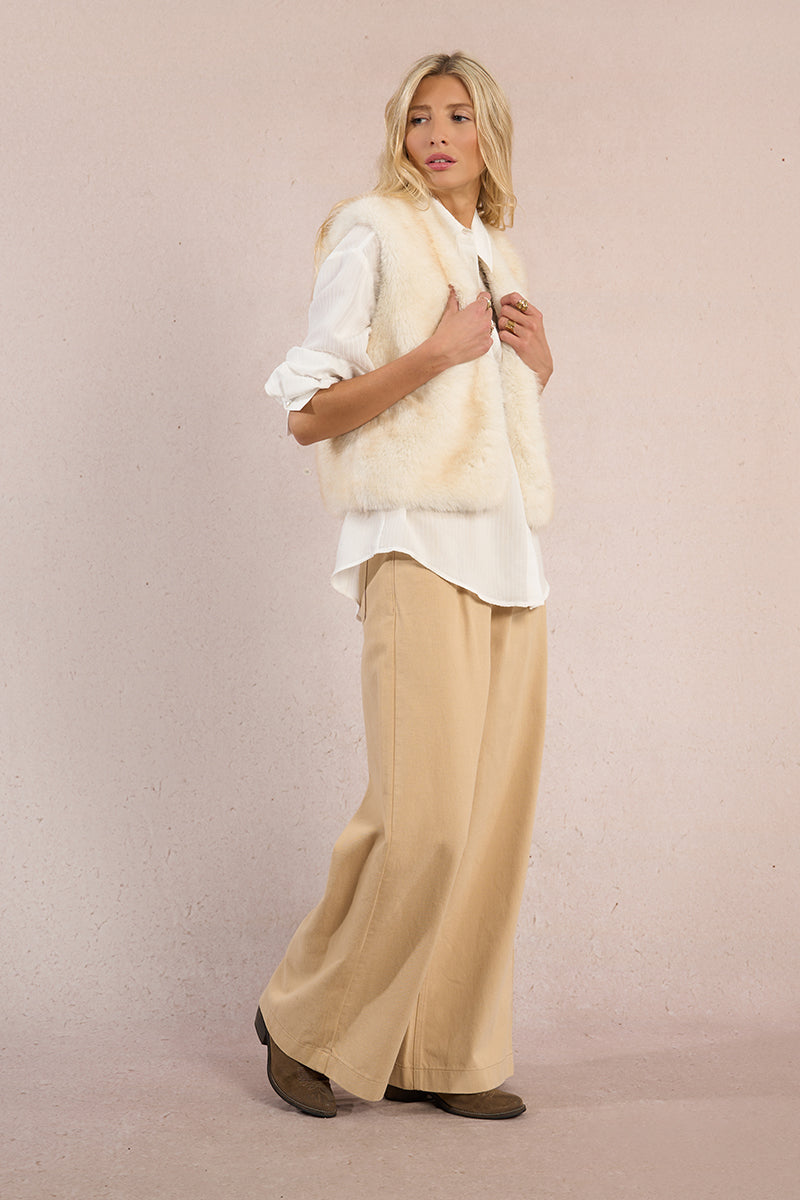 A gentle layer with bohemian charm, this faux fur textured vest offers a soft structure with a straight, cropped cut. and open neckline. Meant to be worn over airy blouses, flowing dresses, or light knits, it brings a sense of ease, earthiness, and quiet intention to your autumn layering.