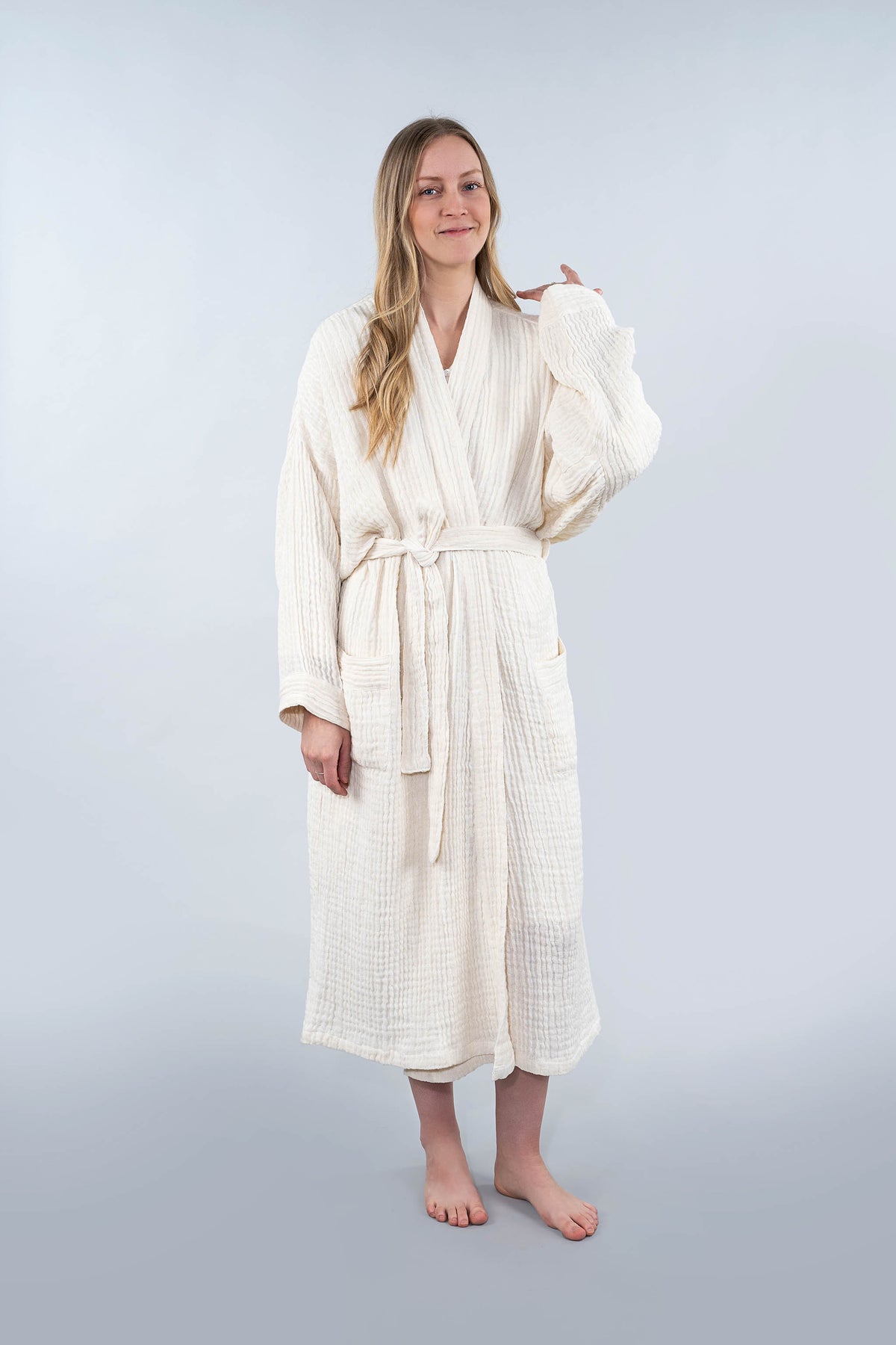 Made from a dreamy blend of 50% linen and 50% cotton in a double-gauze weave, this ultra-soft robe drapes beautifully and becomes even softer over time. The long-line silhouette, gentle billowing sleeves, and adjustable tie closure create a flattering, easy fit for many body types. Luxurious yet effortless, it’s the robe you’ll reach for again and again.