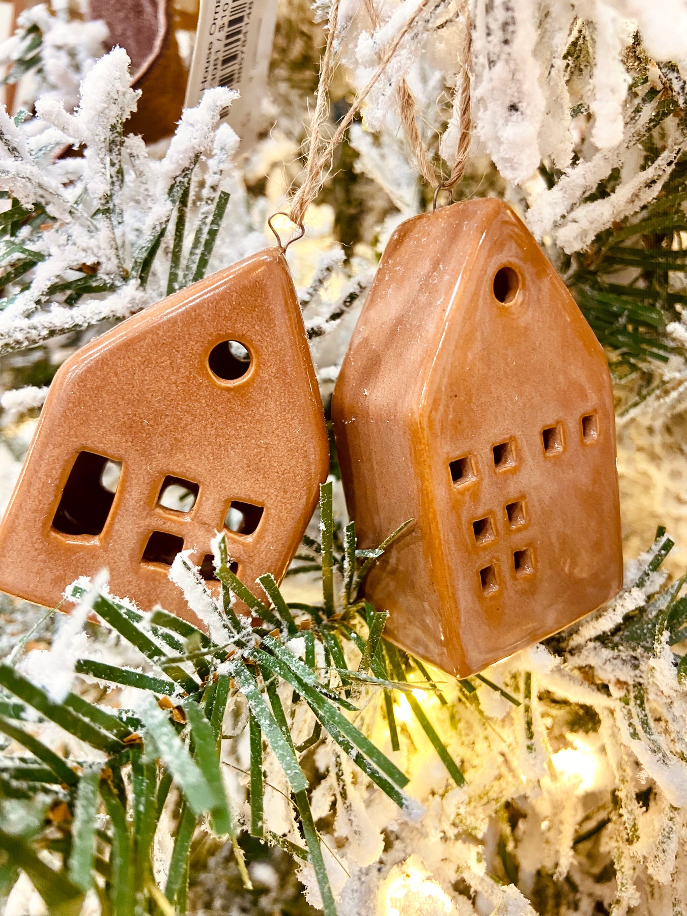 Add a touch of whimsy to your holiday décor with these handcrafted ceramic house ornaments. Full of unique detail and character, each petite house is shaped with care and finished in a cozy terracotta hue that brings warmth to any seasonal setting. Whether hung on the tree or styled on a shelf, this charming duo adds a storybook feel to your festive home.