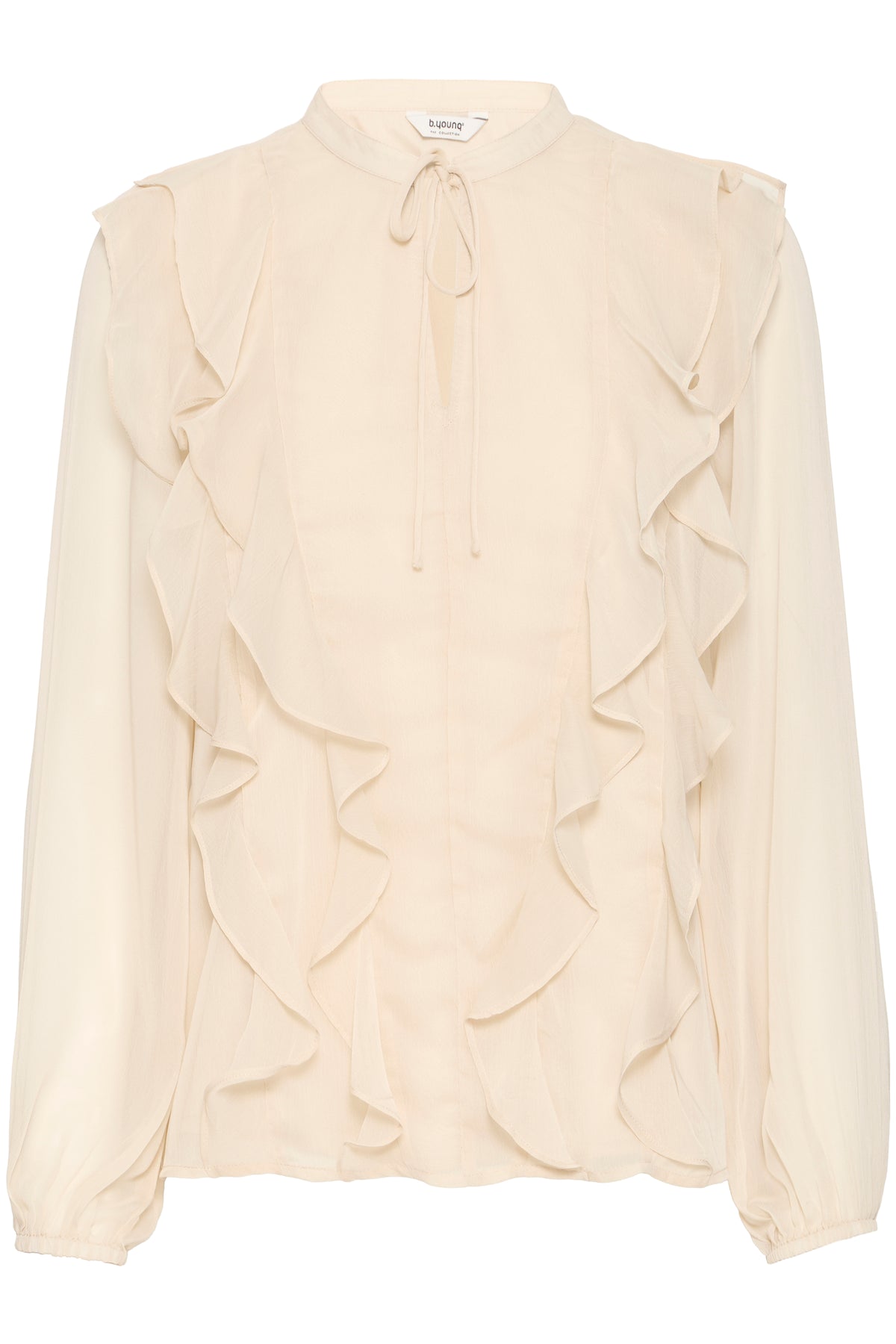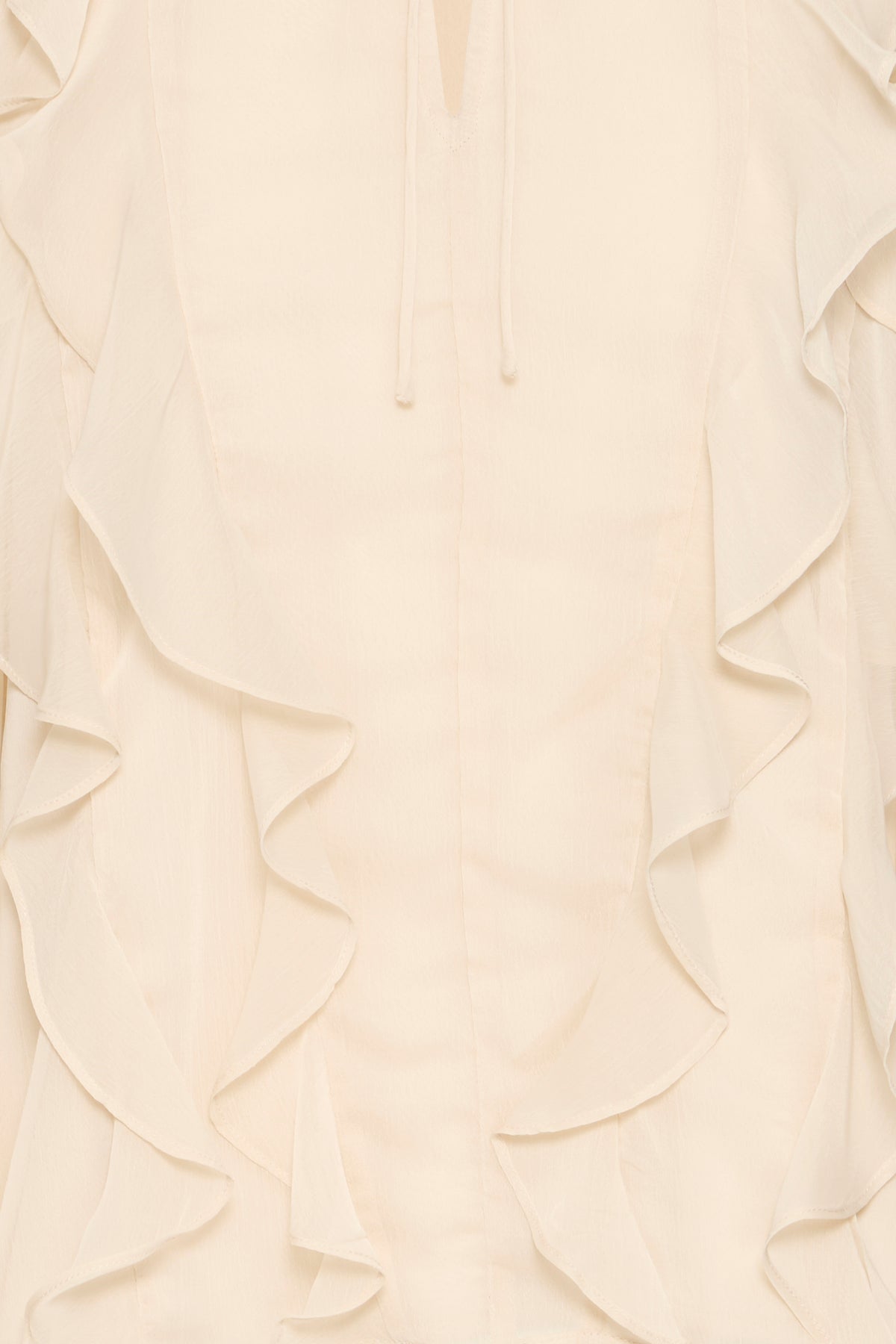 A whisper of romance in every detail — this flowy long-sleeve blouse drapes beautifully with its soft V neckline and double ruffle layers. Effortlessly refined for evenings out, yet quietly confident with denim for everyday allure.