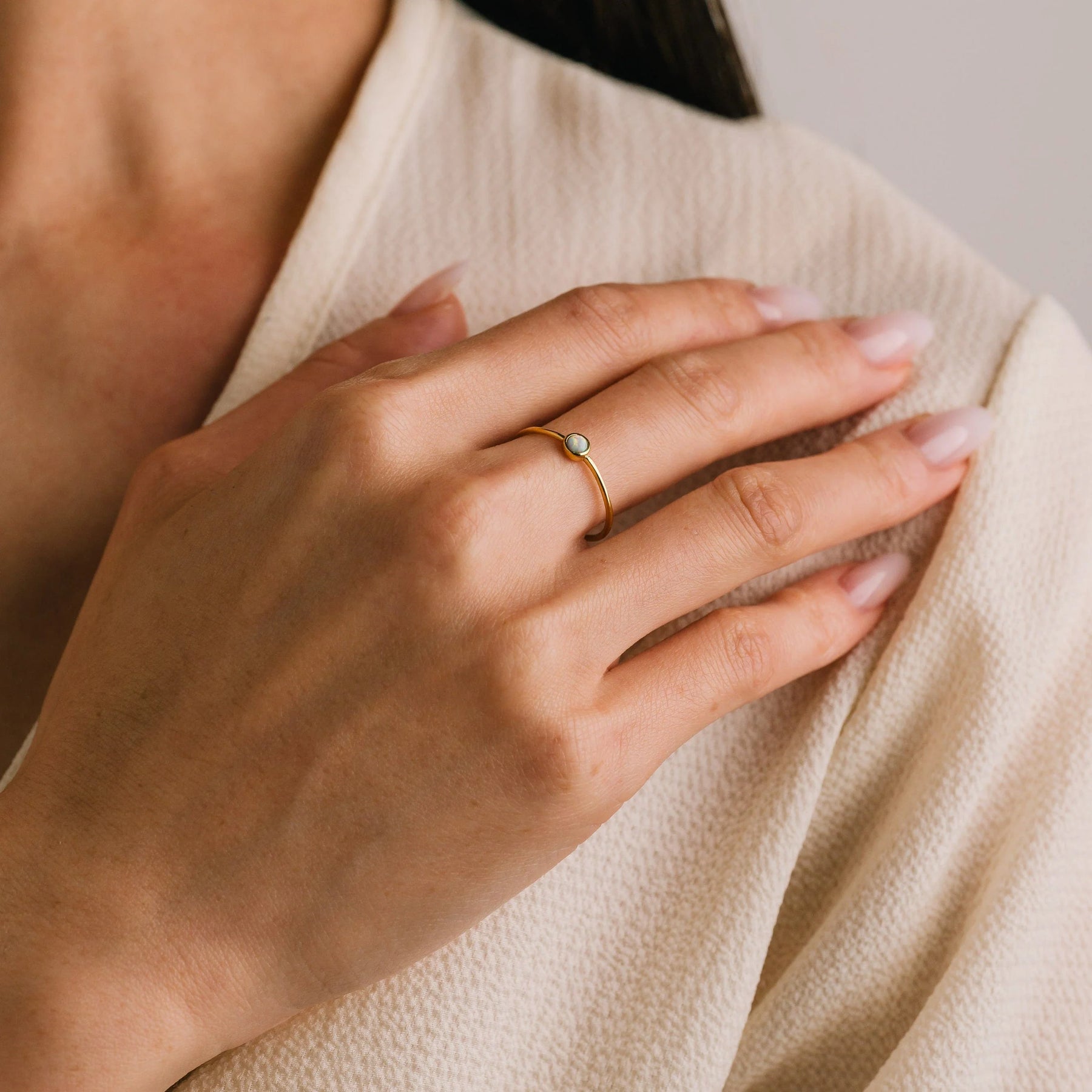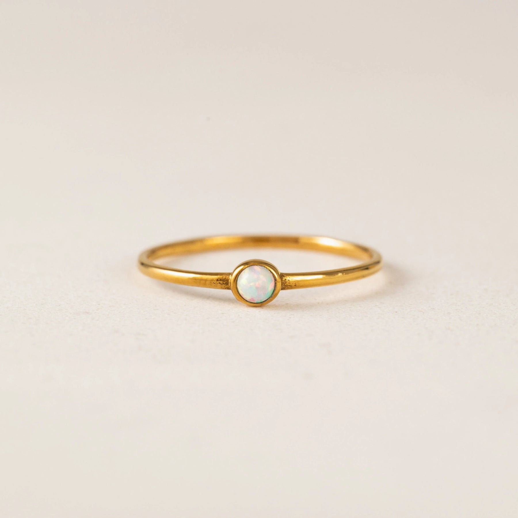 A tiny, iridescent opal framed in sleek gold makes this delicate ring minimalist magic.