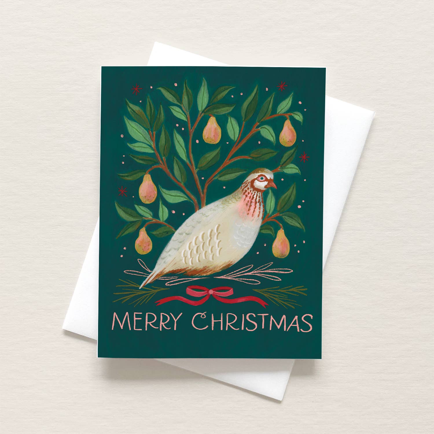This classic holiday card features a delightful watercolour illustration of a plump partridge and a pear tree against a rich green background. Created by Canadian artist Emilie Simpson, this elegant design brings a touch of warmth and traditional charm to your holiday greetings.