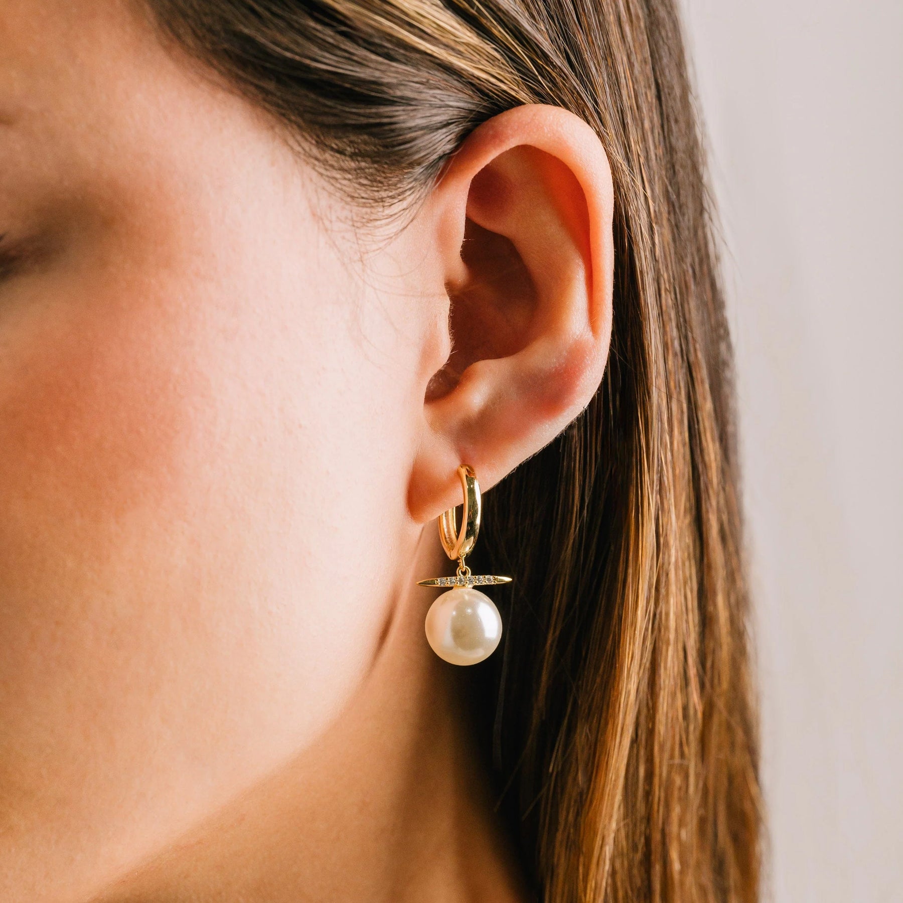 Classic, elegant, and effortlessly refined, these earrings bring a fresh and versatile take on timeless pearl jewelry. A lustrous pearl is paired with a sleek cubic zirconia-studded bar, adding a hint of sparkle and a modern edge. Pop these on to instantly elevate your ensemble, whether it’s a polished work look or a chic evening outfit.