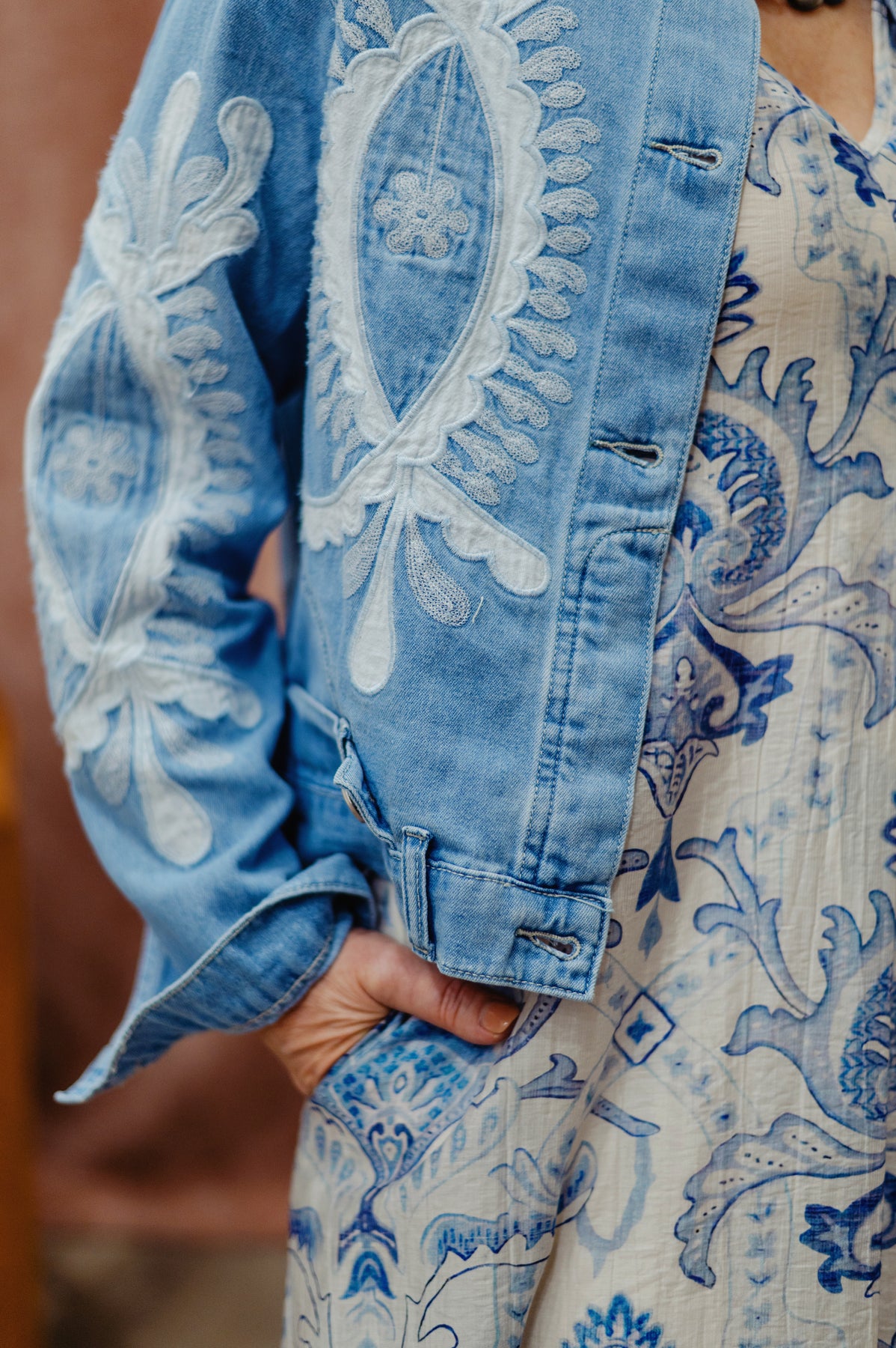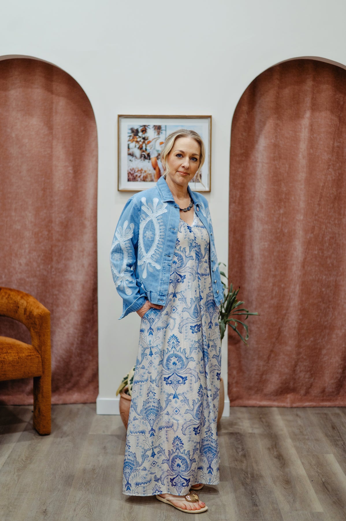 This sleeveless a -line maxi dress captures the serenity of a Grecian-inspired aesthetic with its pale blue watercolor pattern. The V-neckline and flowing silhouette create an elegant, statuesque feel, while the soft, airy fabric moves gracefully with every step. Light, ethereal, and timeless, a perfect piece for summer time special occasions.