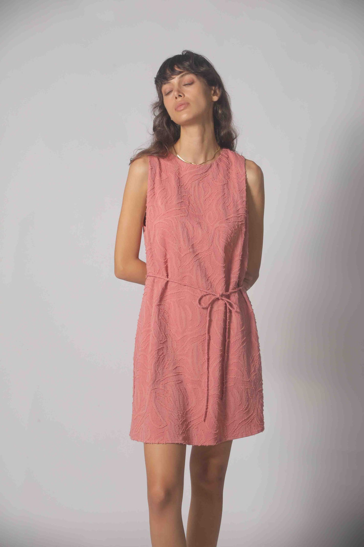 Rendered in a warm dusty pink, this sleeveless summer dress features a textured, lightweight fabric that moves with ease. A tie-waist belt defines the silhouette, adding a gentle, flattering shape, while the airy design keeps it perfect for sun-filled days.