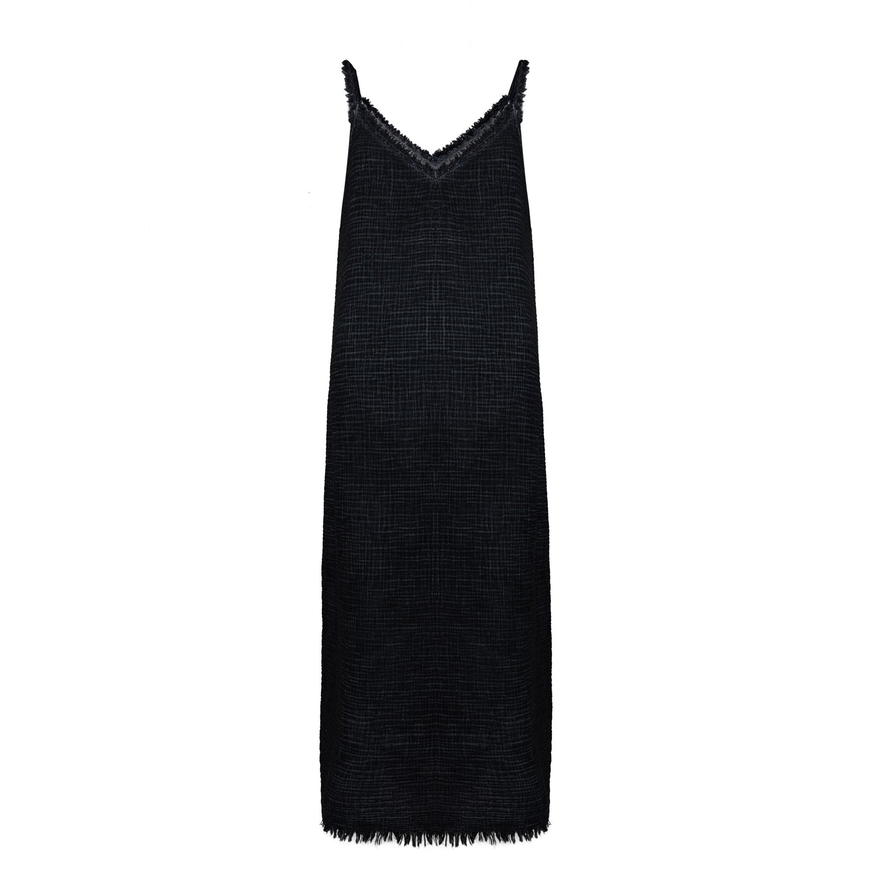 Crafted from breezy crinkle cotton, this V-neck tank dress delivers effortless warm-weather style. Frayed detailing adds laid-back charm, while the relaxed fit makes it perfect for travel, beach days, cottage stays, or simple everyday errands. Easy to pack and easy to wear, it’s a natural go-to for elevated casual comfort.