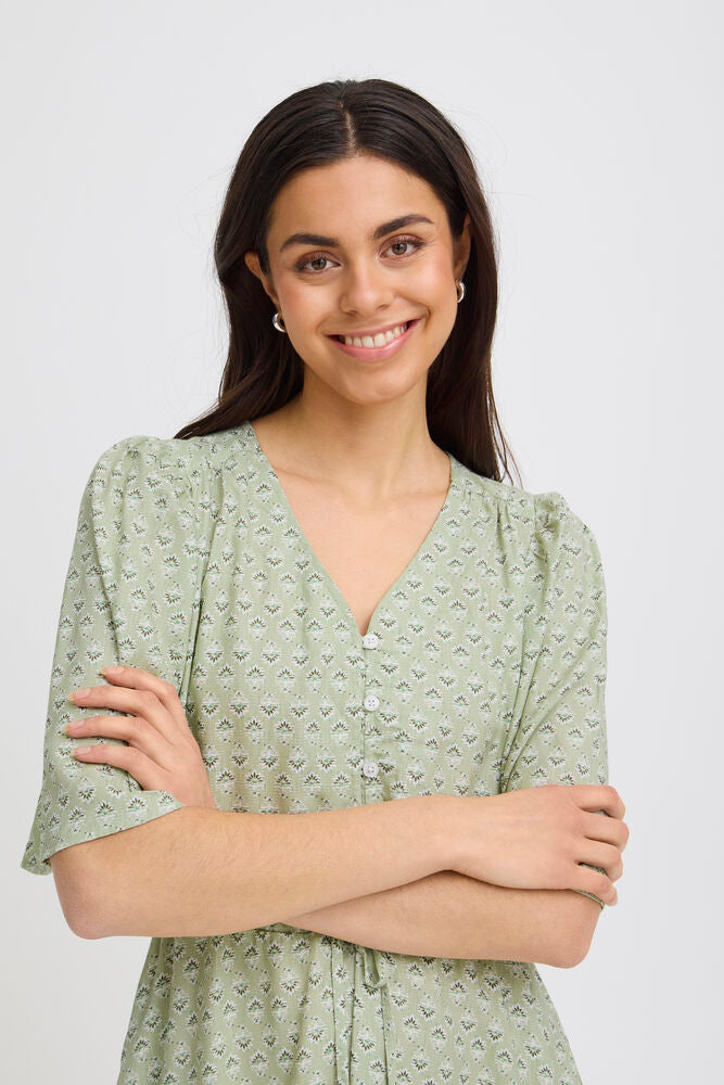 Softly flowing with a relaxed, free-spirited feel, this midi shirt dress is made for days when comfort and style go hand in hand. Crafted from breathable viscose, it offers a light, airy drape. The button-down front adds an effortless structure, while the sage green paisley-inspired print brings a grounded, nature-inspired charm. Loose bell sleeves fall to the elbow for an easy silhouette, complemented by a drawstring waist that lets you shape the fit your way. Finished with practical pockets, it’s thoughtfully designed for laid-back moments and everything in between.