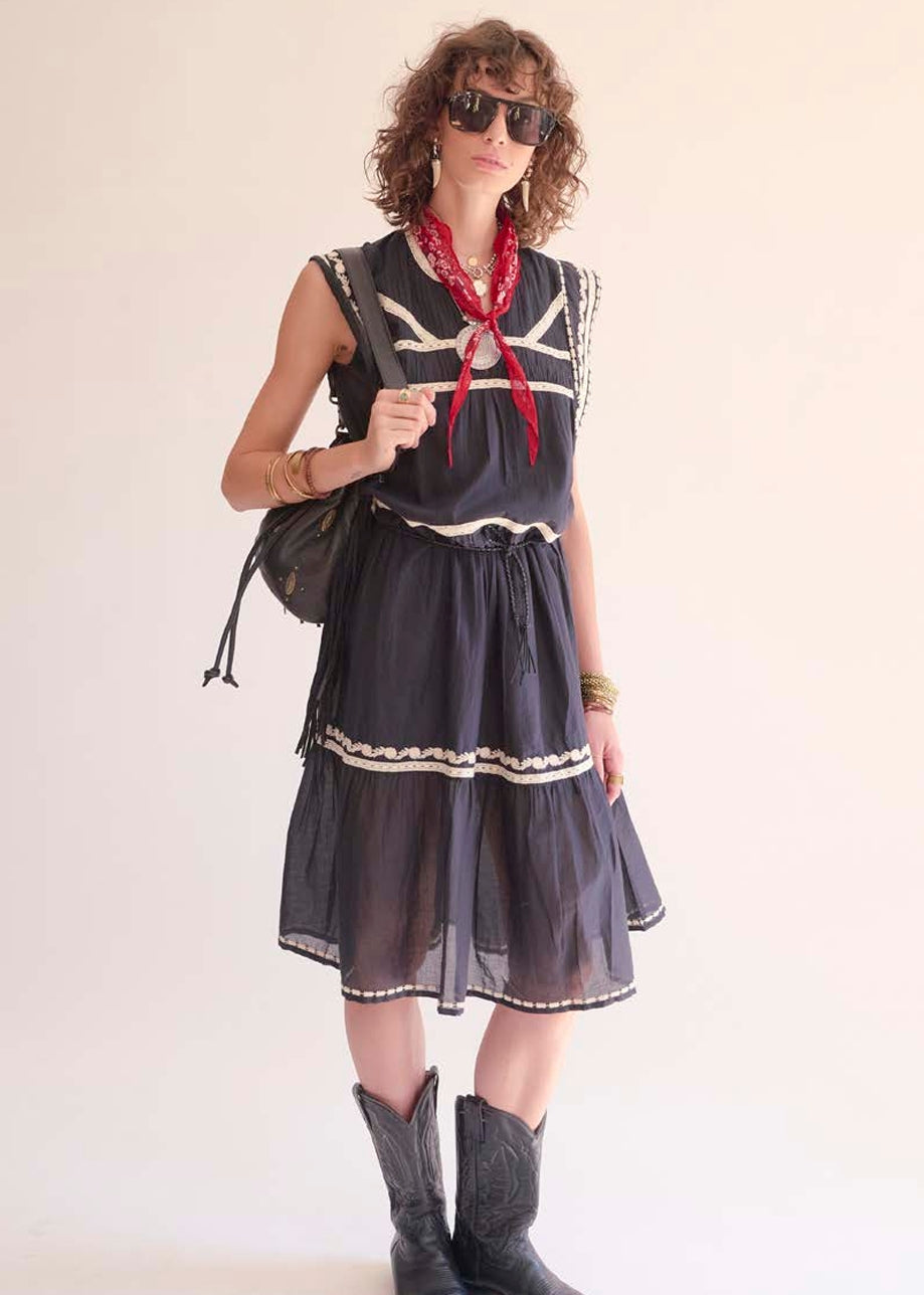 A beautiful blend of texture and quiet detail. This knee-length black gauzy cotton dress features delicate cream embroidery along the bodice and trim, with cap sleeves and a softly tiered skirt that adds gentle movement. Light and breathable with a boho-chic meets country feel.